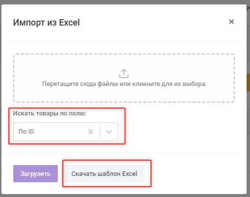 Перед загрузкой данных советуем скачать актуальный шаблон загрузки. После заполнения шаблона загрузки вам необходимо выбрать уникальное поле сопоставления товаров, советуем выбирать сопоставление по ШК или id товара.