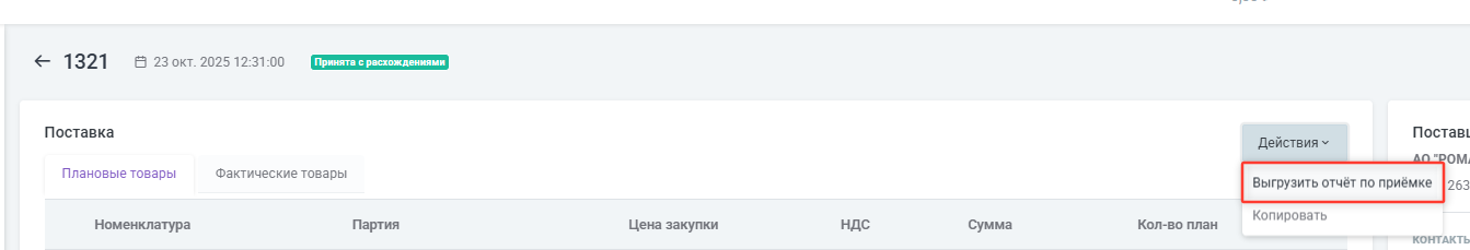 Отчет доступен в принятой поставке. Для его скачивания нажмите "Действия" на странице поставке и пункт "Выгрузить отчет по приемке"