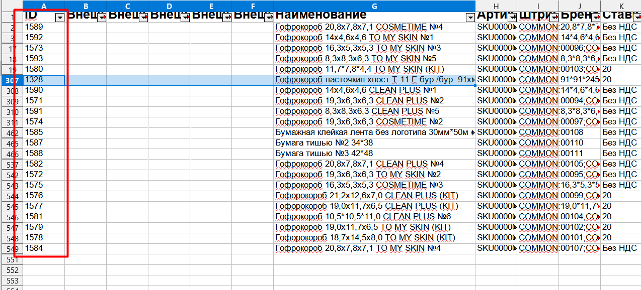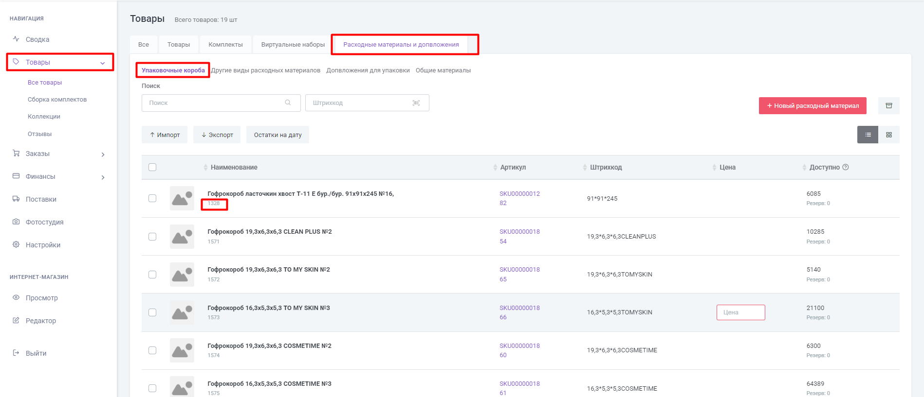 А также столбец «Материалы клиента», указав id упаковочного материала, и количество в формате: товар:1328,количество:1
