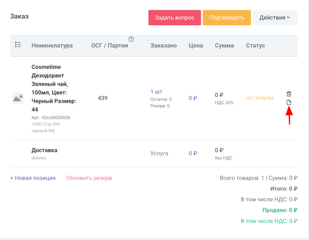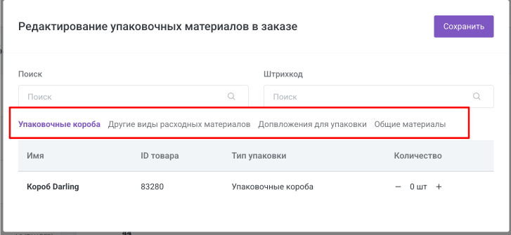 Важно: в заказе не нужно указывать общее количество упаковочных материалов — система рассчитает его автоматически. Достаточно указать упаковку для 1 шт. товара в рамках позиции.